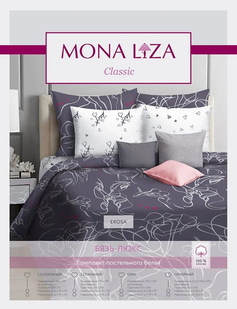 Коллекция постельного белья из импортной бязи Премиум класса от компании "MONA LIZA". Ткань полотняного переплетения с незначительной сменяемостью, хорошо сохраняющая цвет при стирке, легкая, с прекрасными гигиеническими показателями. Самая широкая линейка дизайнов в торговой марке "MONA LIZA" - для любого стилевого и цветового решения интерьера.
