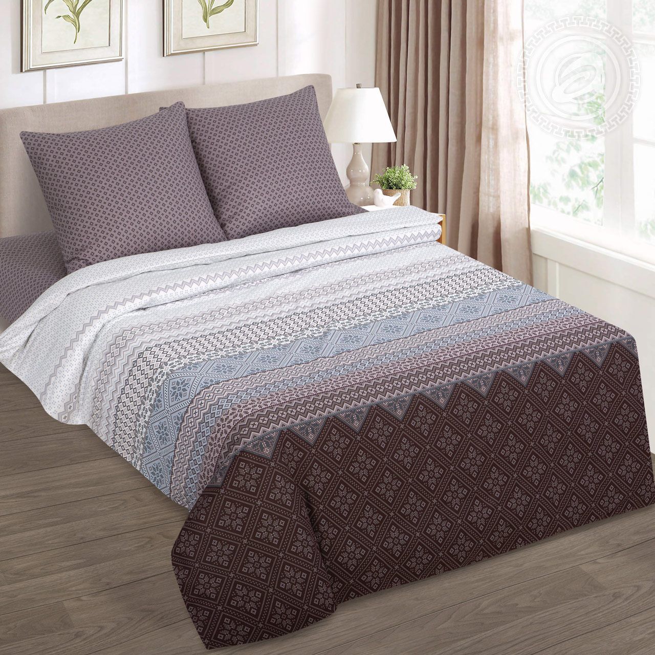 Неповторимый дизайн «Мирослава» — это классический принт с геометрией в новаторском исполнении. Композиция изящна и оригинальна. Она представляет собой самобытный орнамент с ромбами, волнистыми линиями, которые сплетаются в причудливый узор. Постельный набор из ткани бязь с колоритными мотивами дарит ощущение комфорта и отдыха.